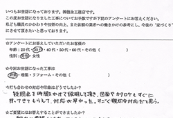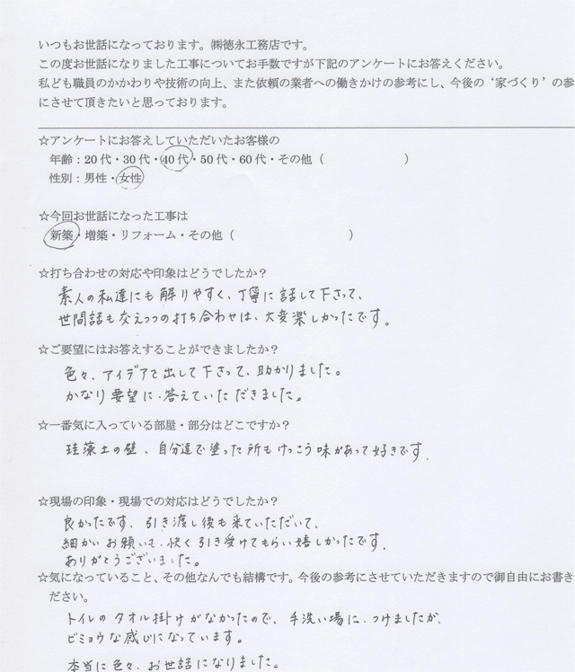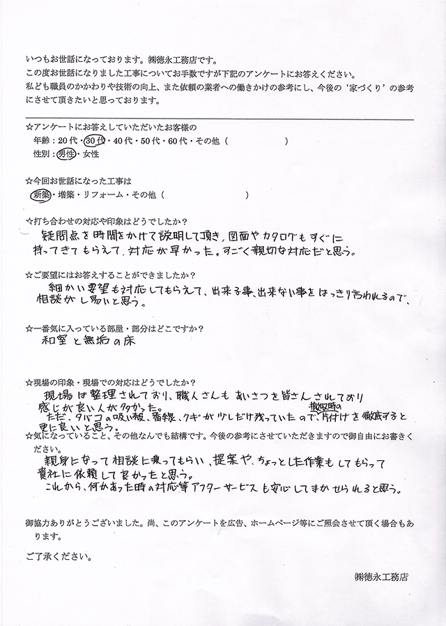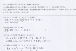 弊社では、お引き渡しして1年以上経過したお客様へアンケートを行っております。