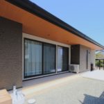 外観は落ち着きのあるダークトーンに、深い軒と木目の軒天が重厚感と温かみを添えています。